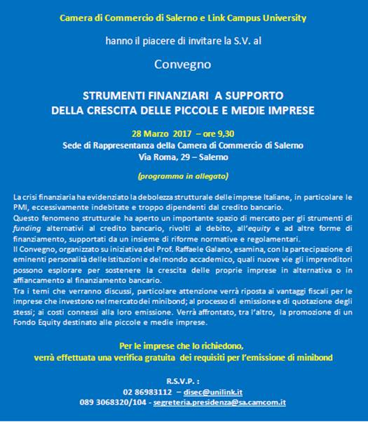 Il Convegno, organizzato su iniziativa del Prof. Raffaele Galano, esamina, con la partecipazione di eminenti personalità delle Istituzioni e del mondo accademico, quali nuove vie gli imprenditori possono esplorare per sostenere la crescita delle proprie imprese in alternativa o in affiancamento al finanziamento bancario.